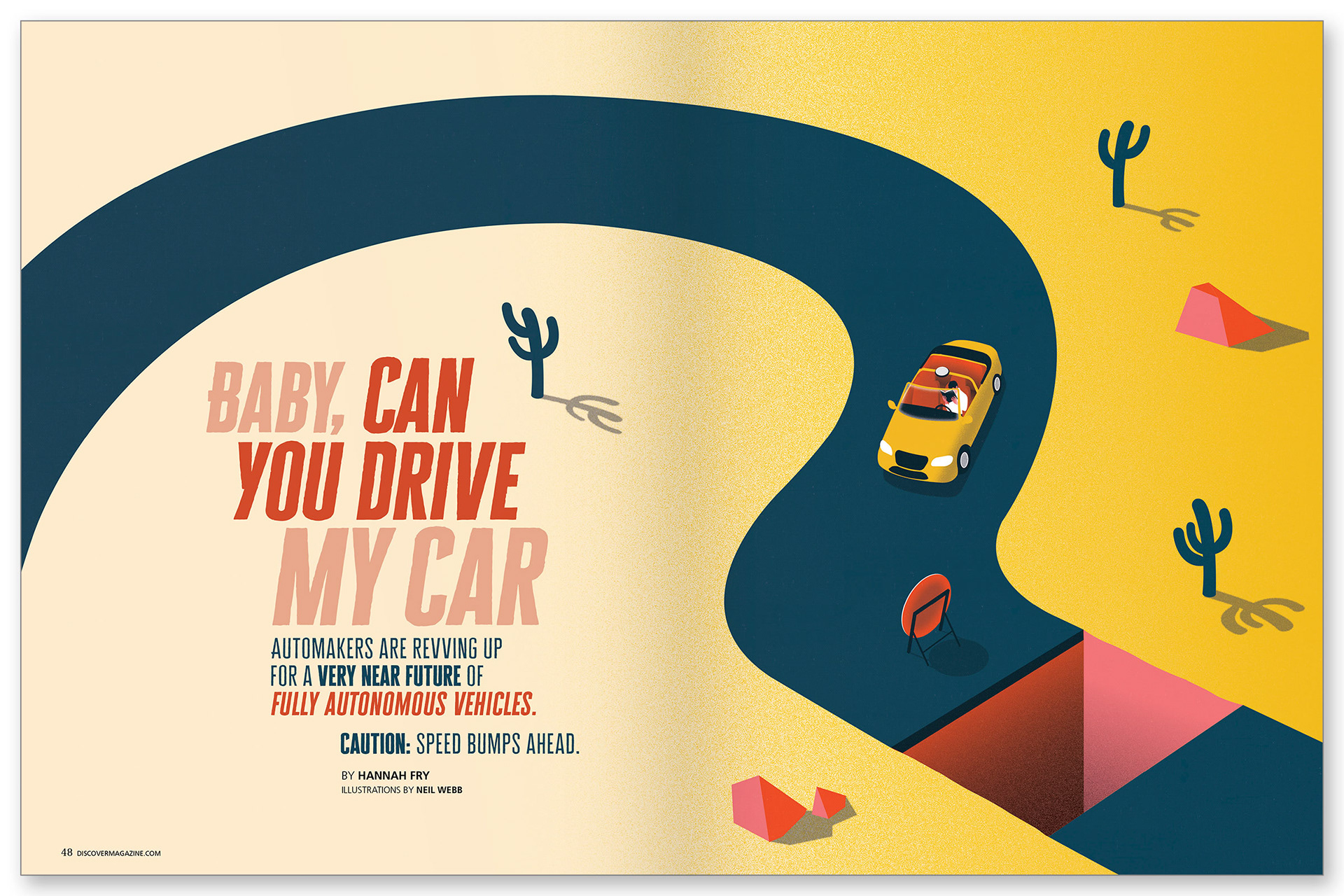 I handled all layout and typography for this layout from the November 2018 issue of Discover magazine, in addition to the look/feel and commissioning the accompanying artwork. Instead of photos of un-matching photos of vehicles for this story, I wanted a more fun, illustrative approach, so I hired freelance artist Neil Webb to create this package of delightful illustrations.