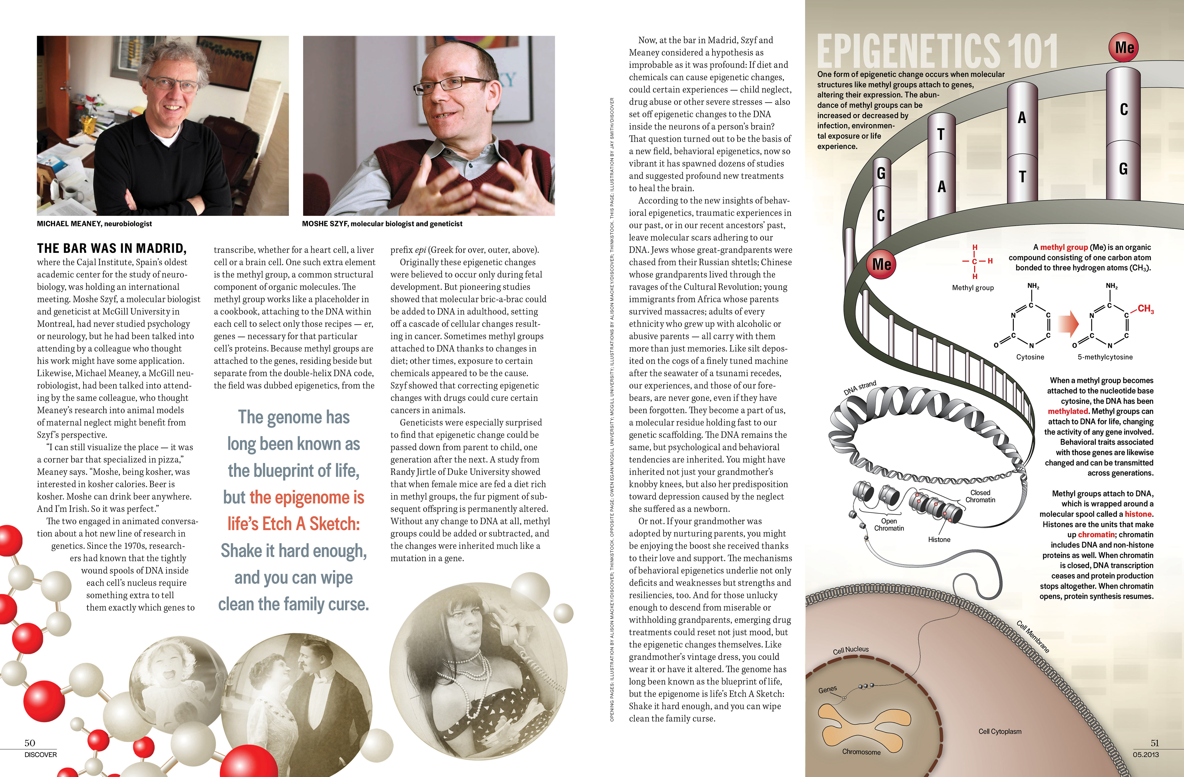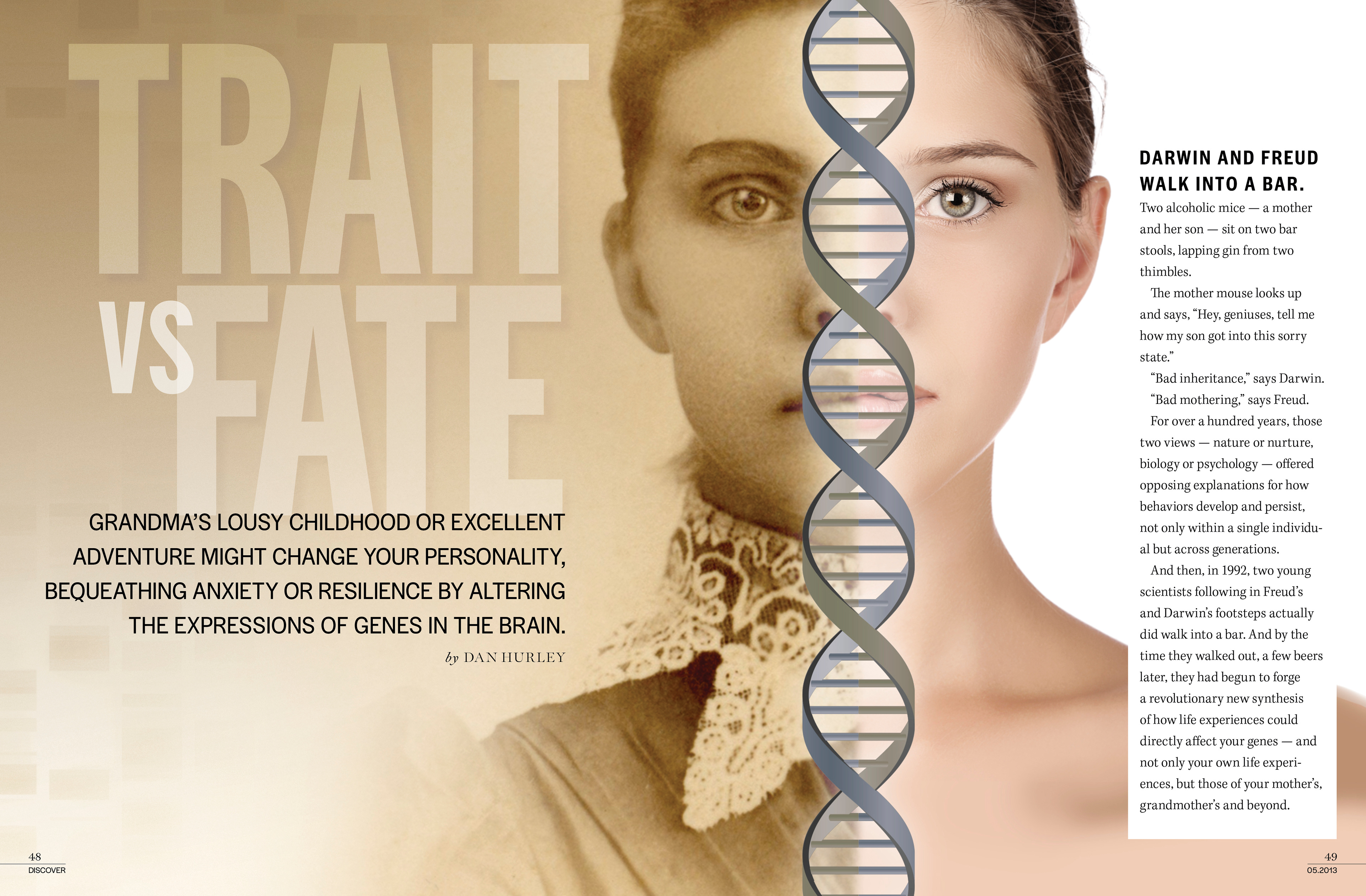 One of my favorite pieces created for the June 2013 issue of Discover magazine. I was responsible for layout, typography, finding and creating all art. I created the lead and secondary portrait collages by painstakingly comparing stock model photos to public domain art, combining them in Photoshop over a DNA image also in public domain. I worked with Illustrator Jay Smith to create the DNA infographic.